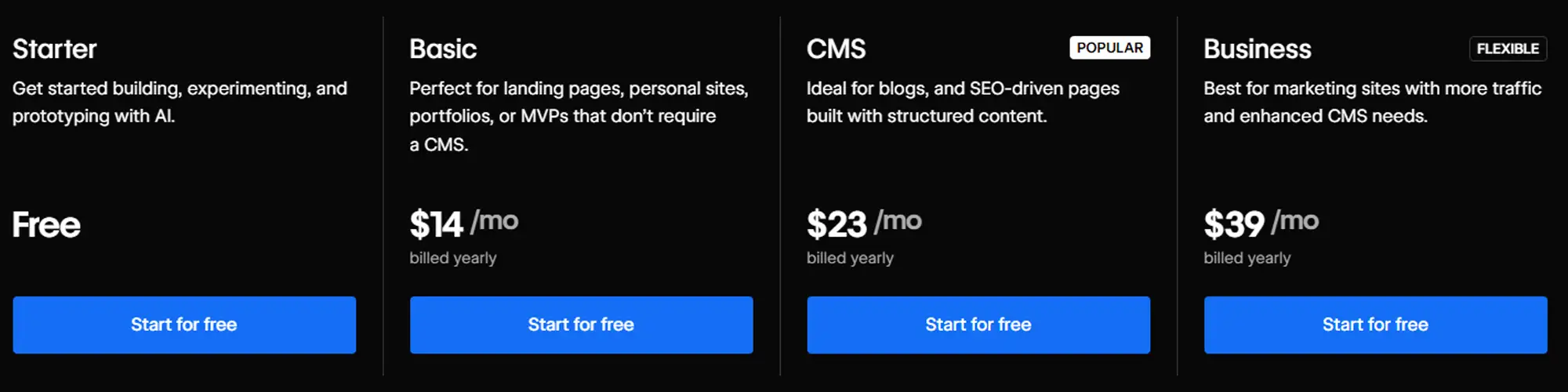 Webflow propose un modèle abonnement tout-inclus avec un prix fixe mensuel. Simple, prévisible, mais vous payez même si vous utilisez peu.
